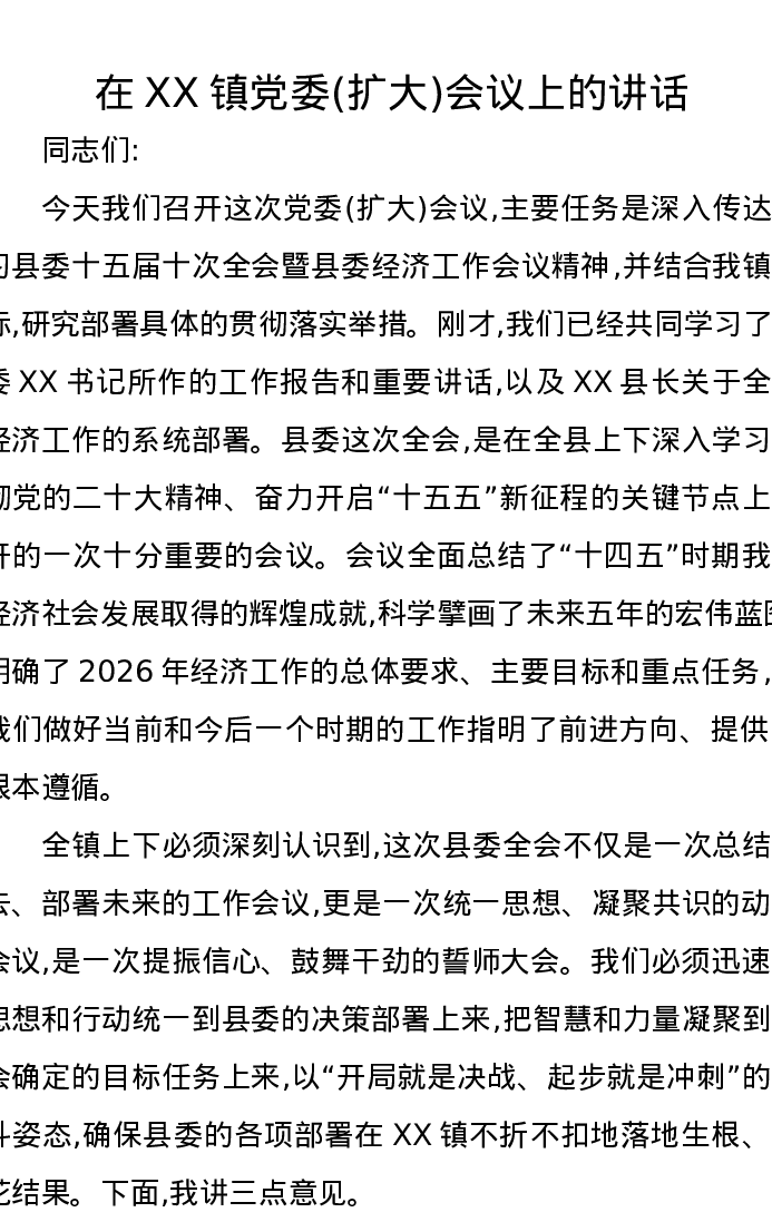 在XX镇党委(扩大)会议上的讲话3