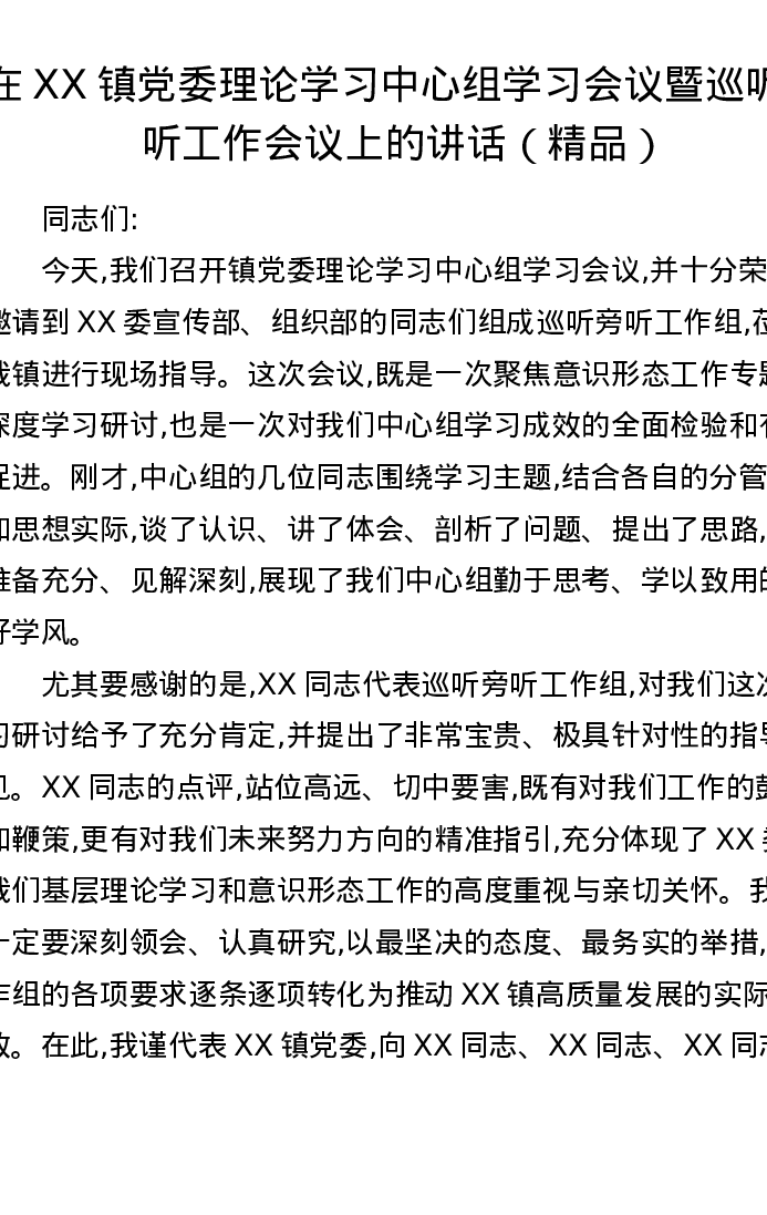 在XX镇党委理论学习中心组学习会议暨巡听旁听工作会议上的讲话