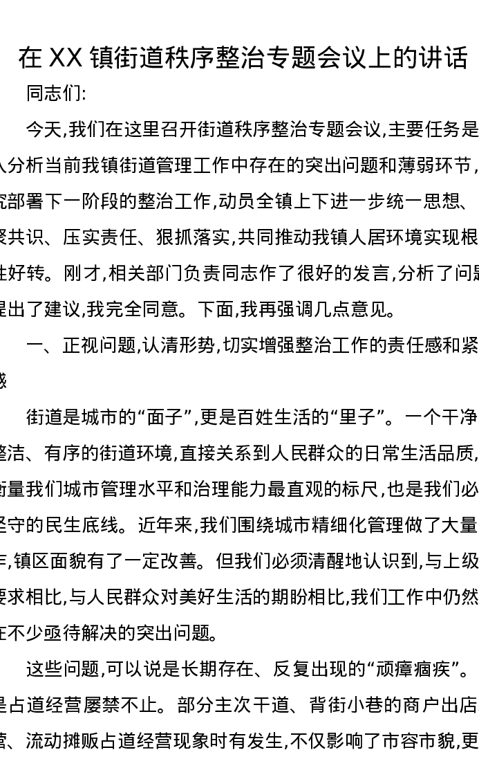在XX镇街道秩序整治专题会议上的讲话