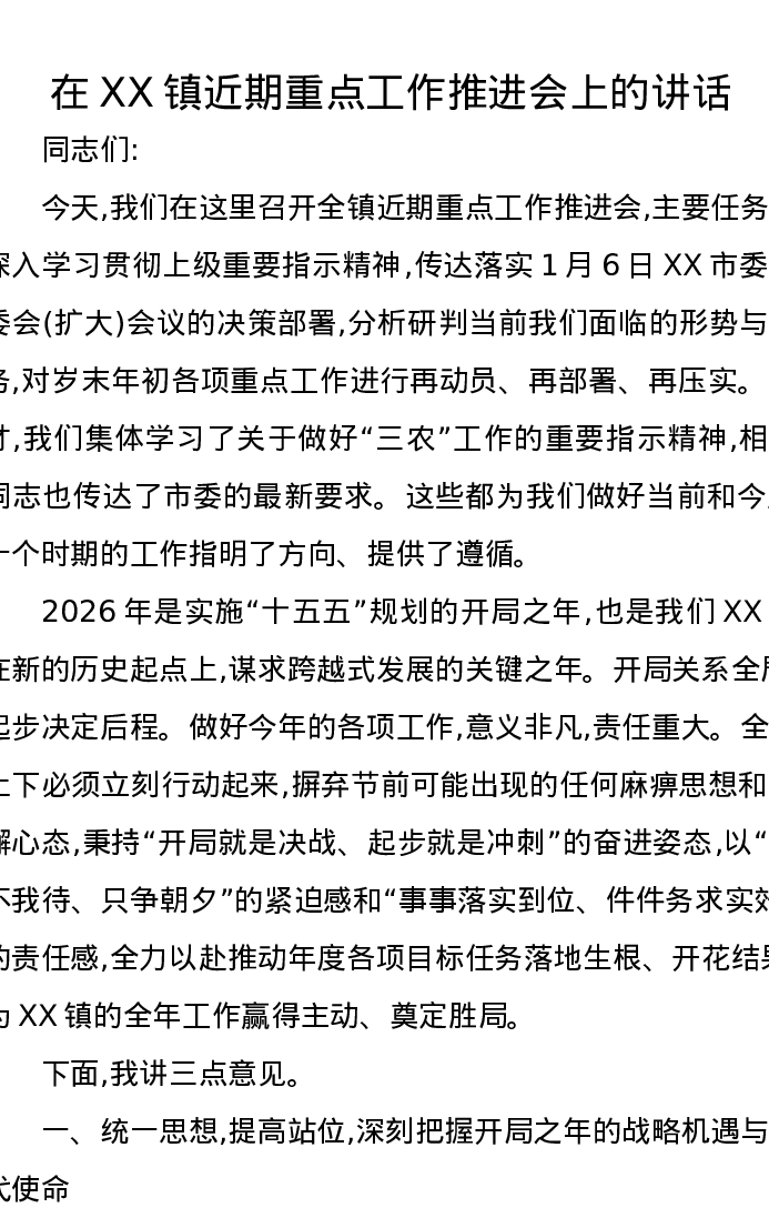 在XX镇近期重点工作推进会上的讲话