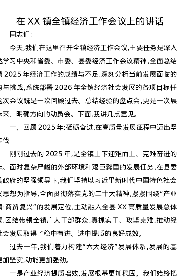 在XX镇全镇经济工作会议上的讲话