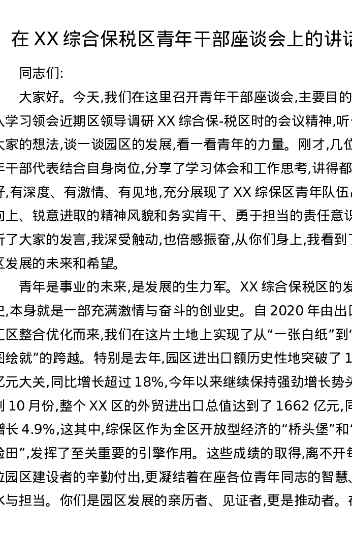 在XX综合保税区青年干部座谈会上的讲话