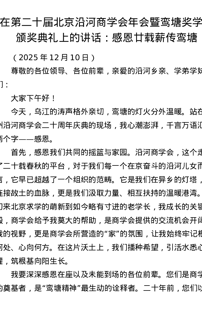 在第二十届北京沿河商学会年会暨鸾塘奖学金颁奖典礼上的讲话:感恩廿载薪传鸾塘