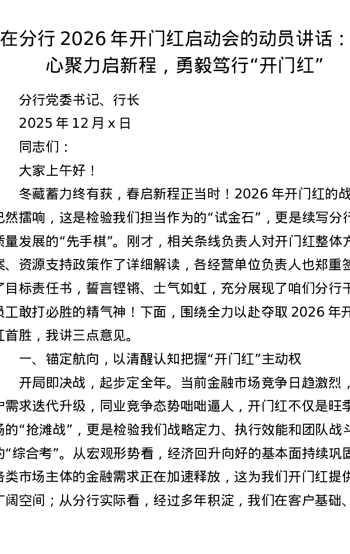 在分行2026年开门红启动会的动员讲话:凝心聚力启新程,勇毅笃行开门红