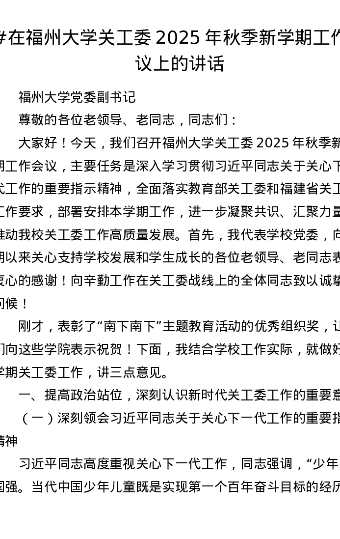 在福州大学关工委2025年秋季新学期工作会议上的讲话