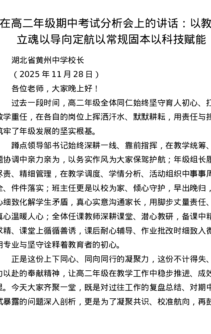 在高二年级期中考试分析会上的讲话:以教风立魂以导向定航以常规固本以科技赋能