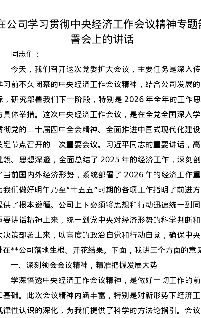 在公司学习贯彻中央经济工作会议精神专题部署会上的讲话