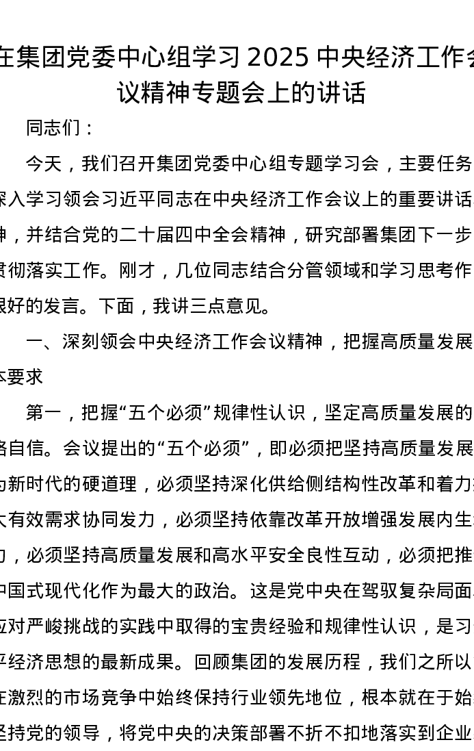 在集团党委中心组学习2025中央经济工作会议精神专题会上的讲话