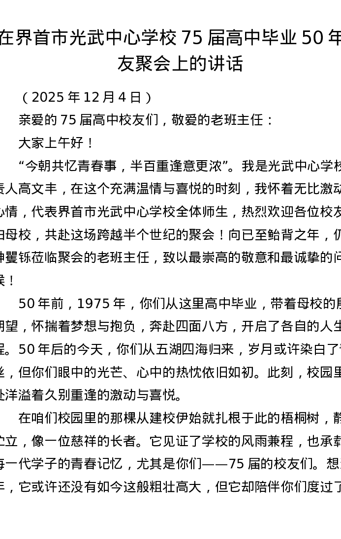 在界首市光武中心学校75届高中毕业50年校友聚会上的讲话