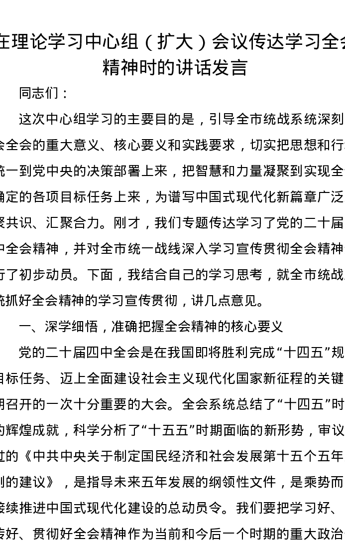 在理论学习中心组(扩大)会议传达学习全会精神时的讲话发言