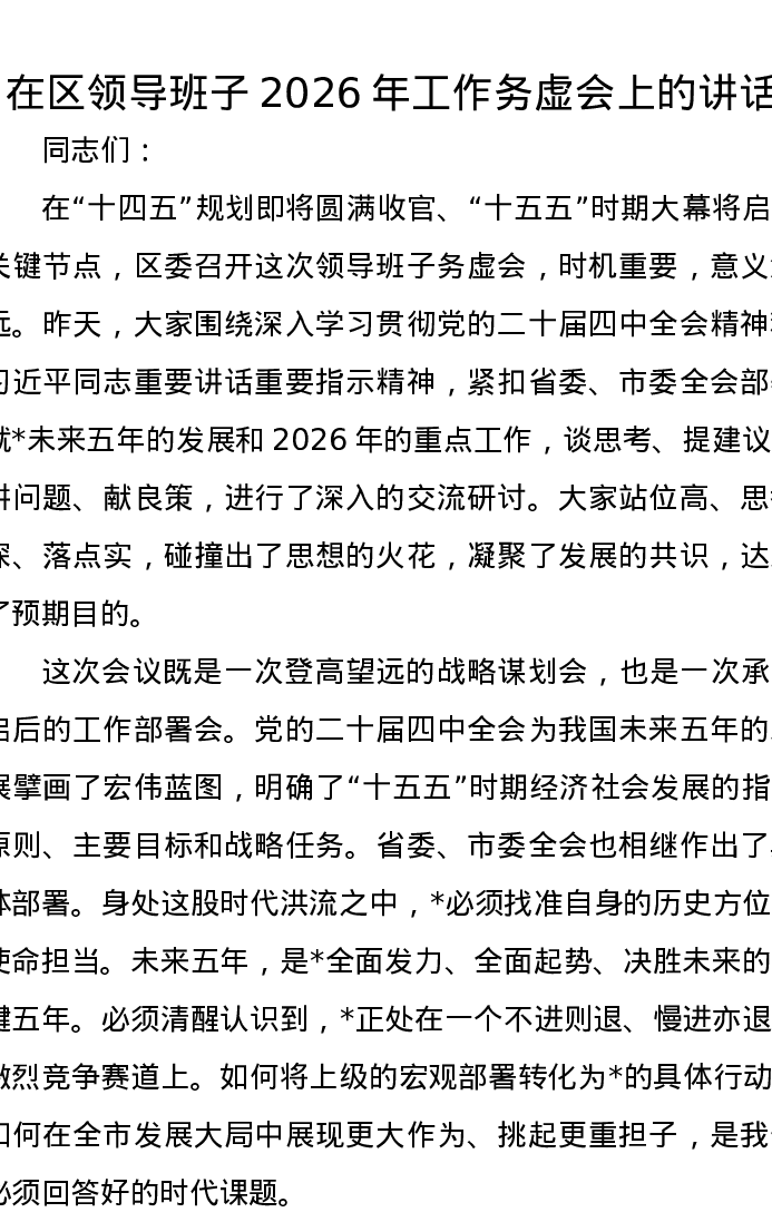 在区领导班子2026年工作务虚会上的讲话