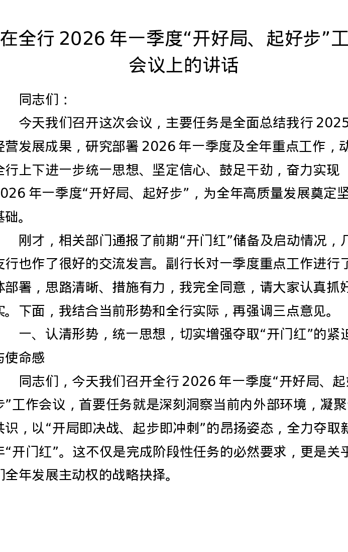 在全行2026年一季度开好局、起好步工作会议上的讲话
