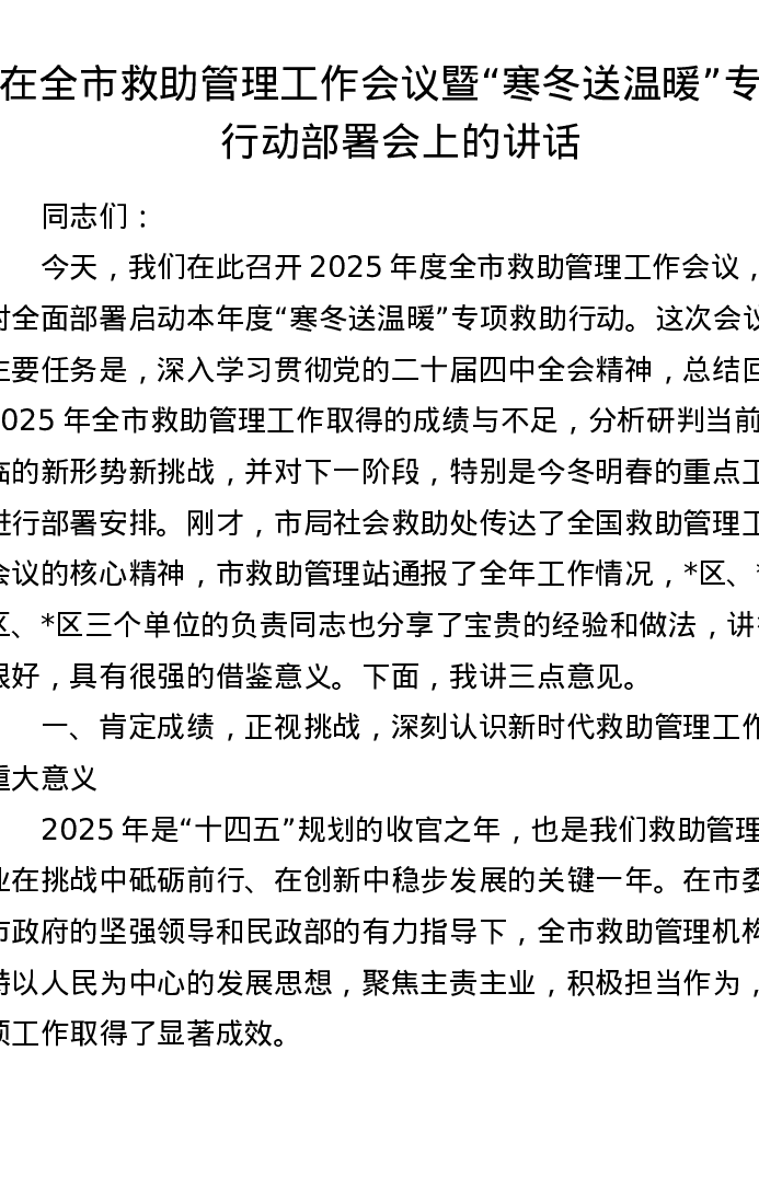 在全市救助管理工作会议暨寒冬送温暖专项行动部署会上的讲话