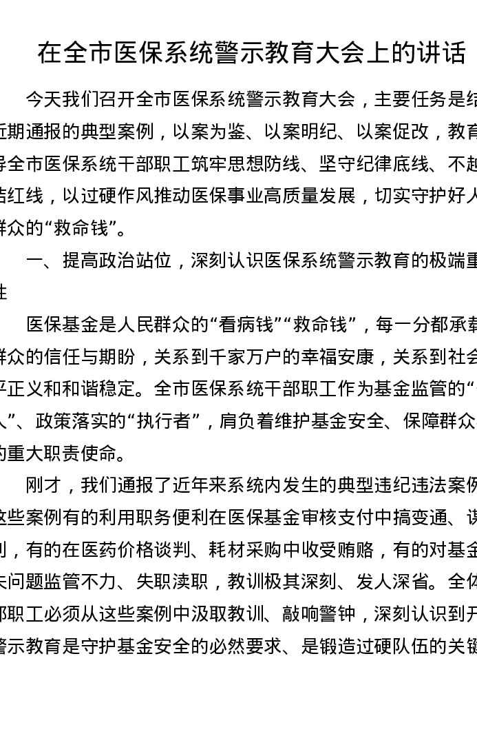 在全市医保系统警示教育大会上的讲话
