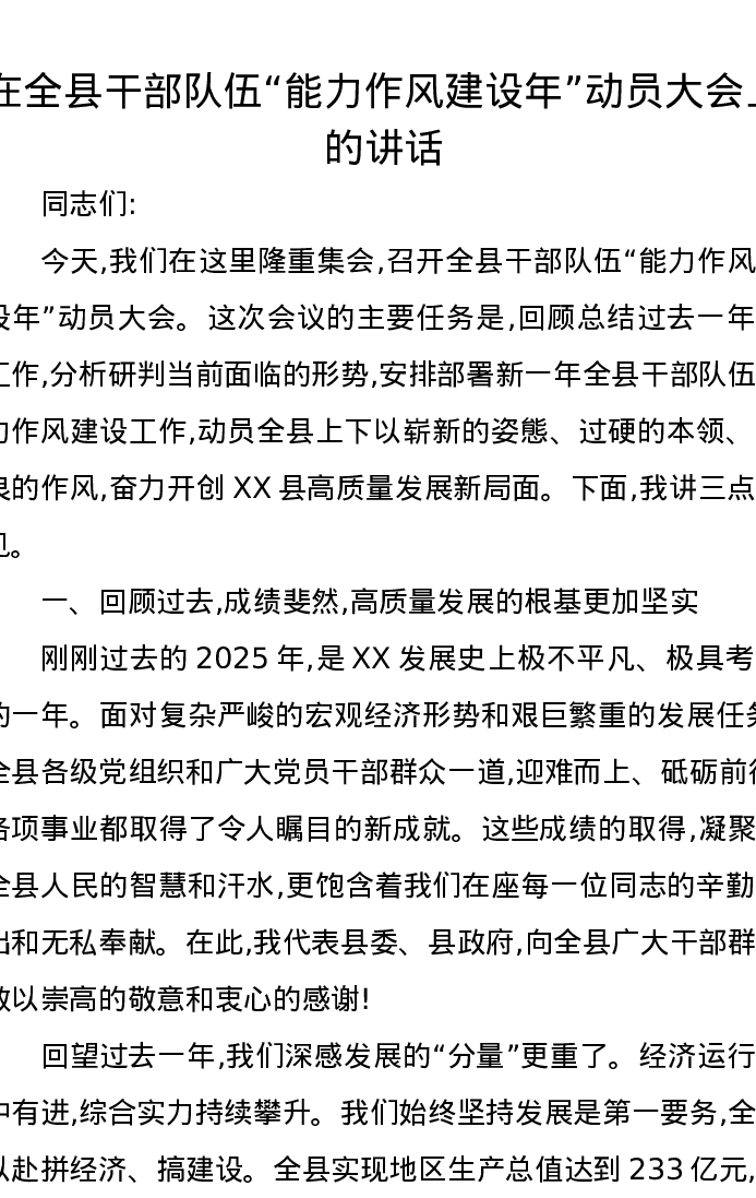 在全县干部队伍能力作风建设年动员大会上的讲话