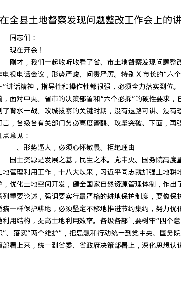 在全县土地督察发现问题整改工作会上的讲话