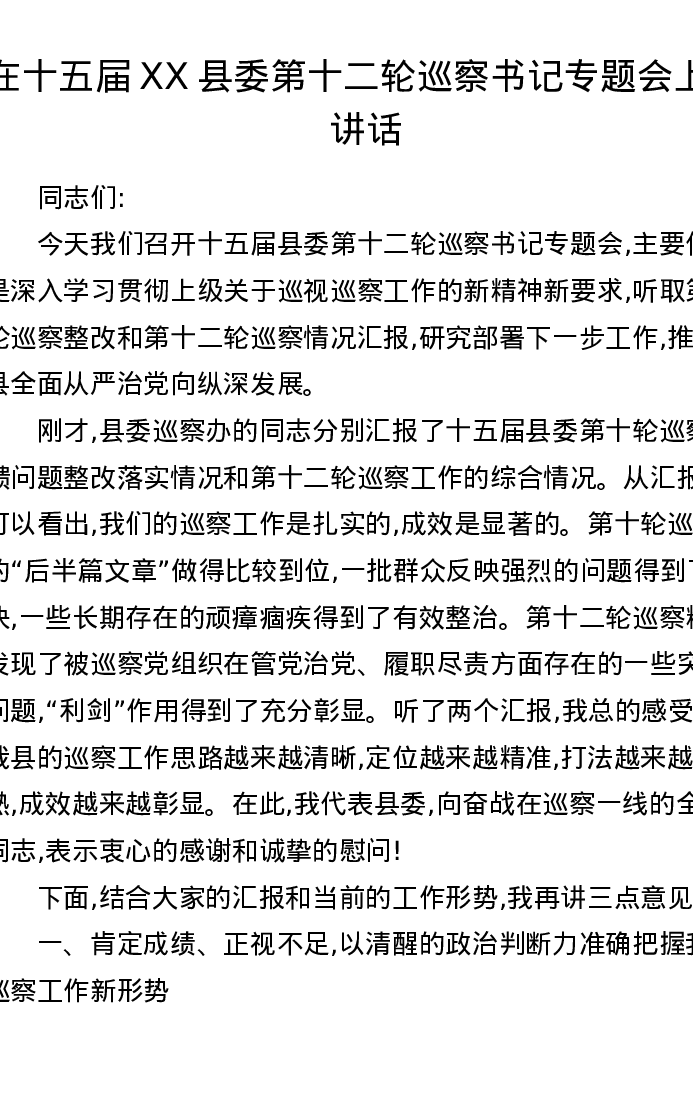 在十五届XX县委第十二轮巡察书记专题会上的讲话