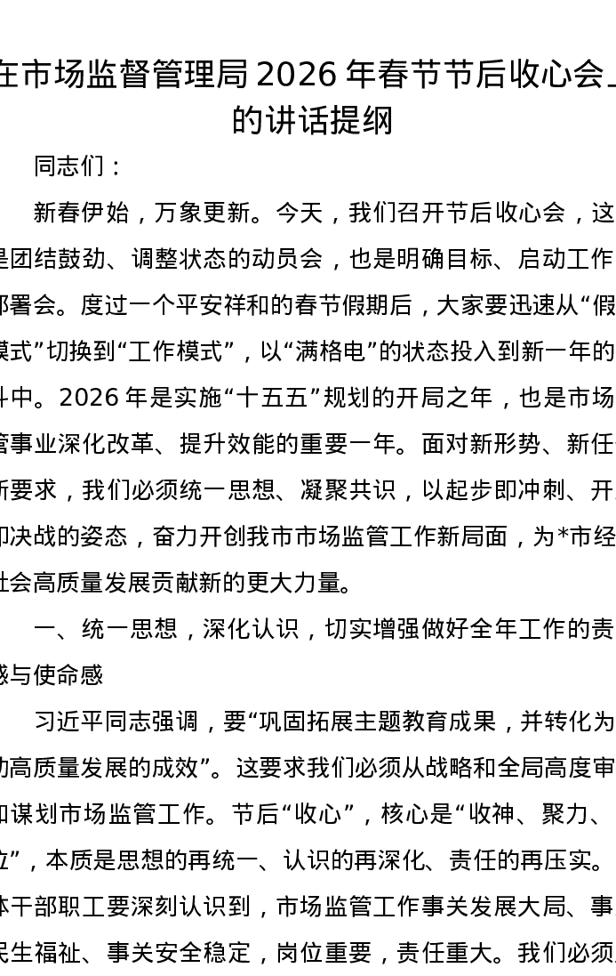 在市场监督管理局2026年春节节后收心会上的讲话提纲