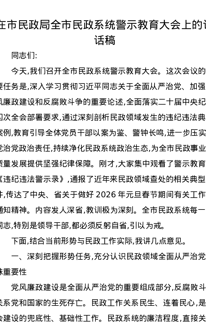 在市民政局全市民政系统警示教育大会上的讲话稿