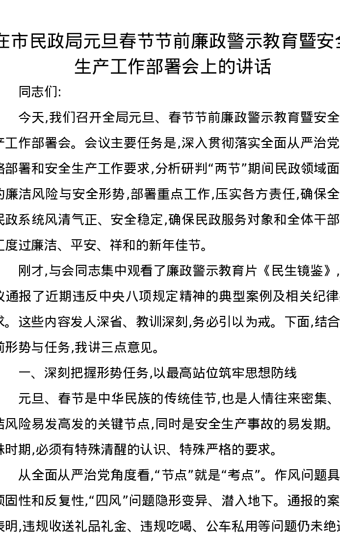 在市民政局元旦春节节前廉政警示教育暨安全生产工作部署会上的讲话