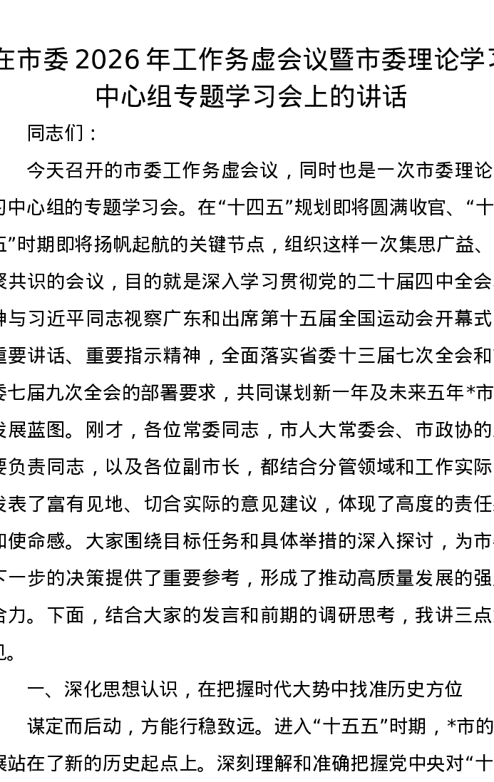 在市委2026年工作务虚会议暨市委理论学习中心组专题学习会上的讲话