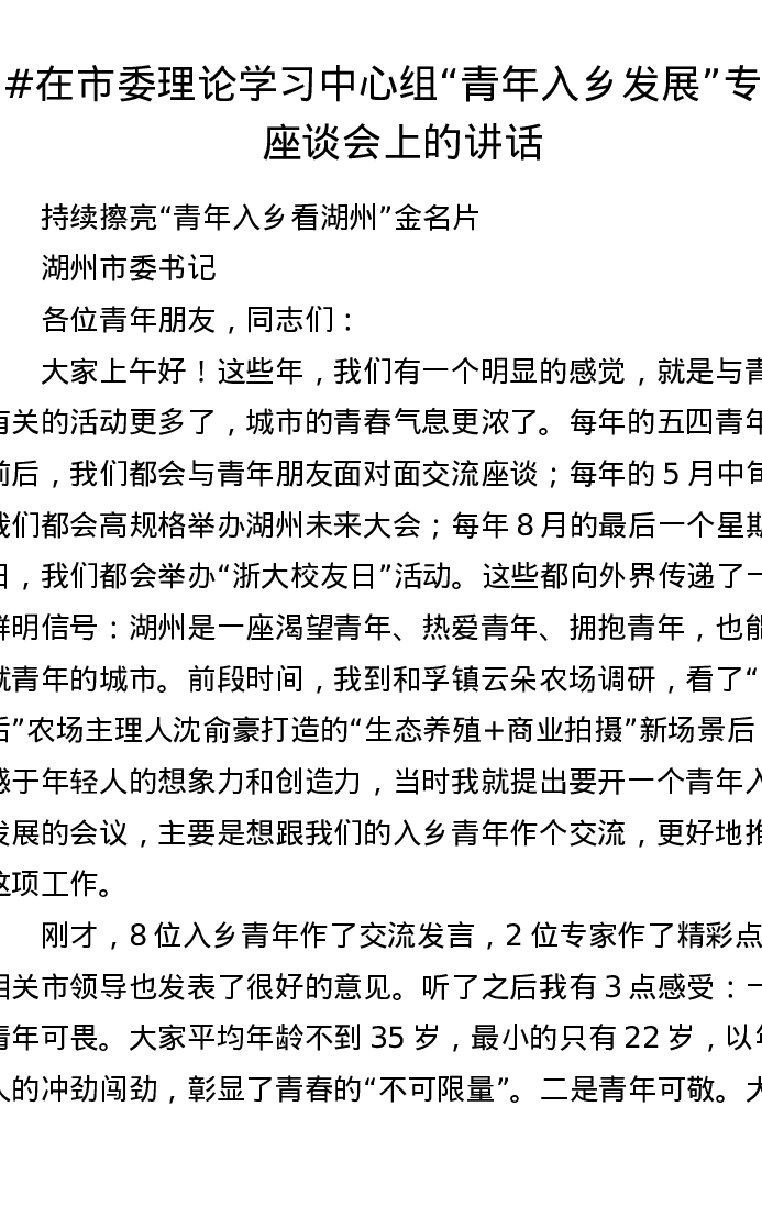 在市委理论学习中心组青年入乡发展专题座谈会上的讲话