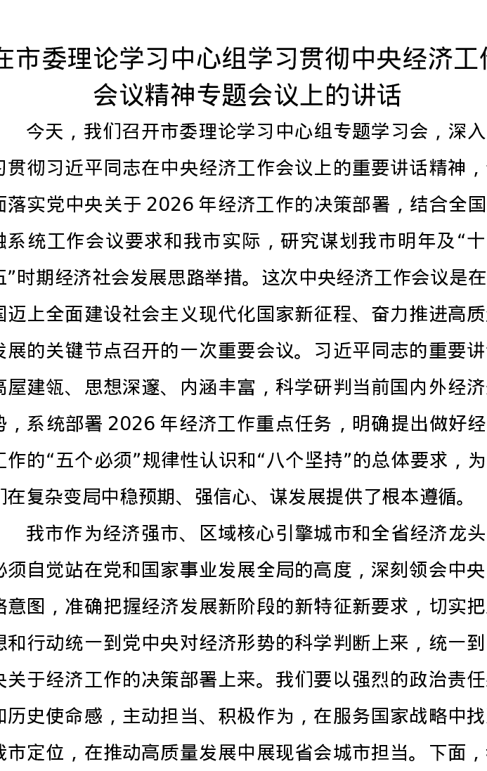 在市委理论学习中心组学习贯彻中央经济工作会议精神专题会议上的讲话