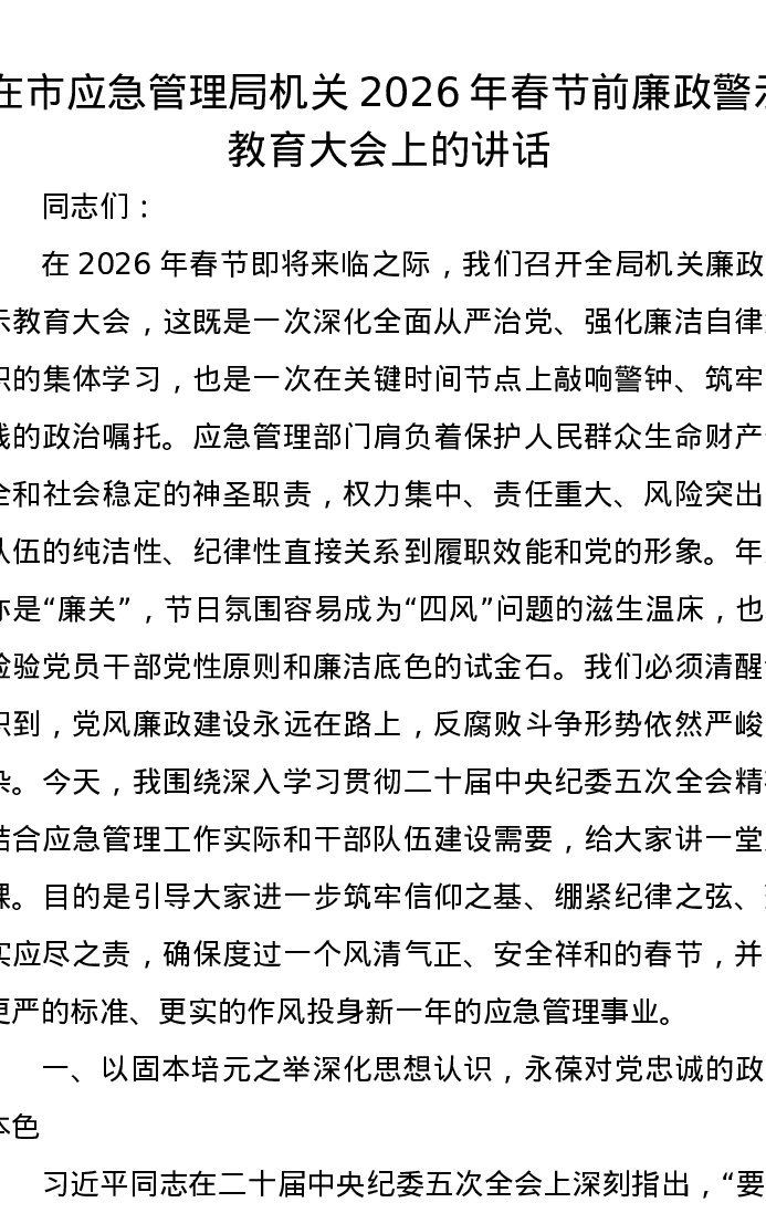 在市应急管理局机关2026年春节前廉政警示教育大会上的讲话