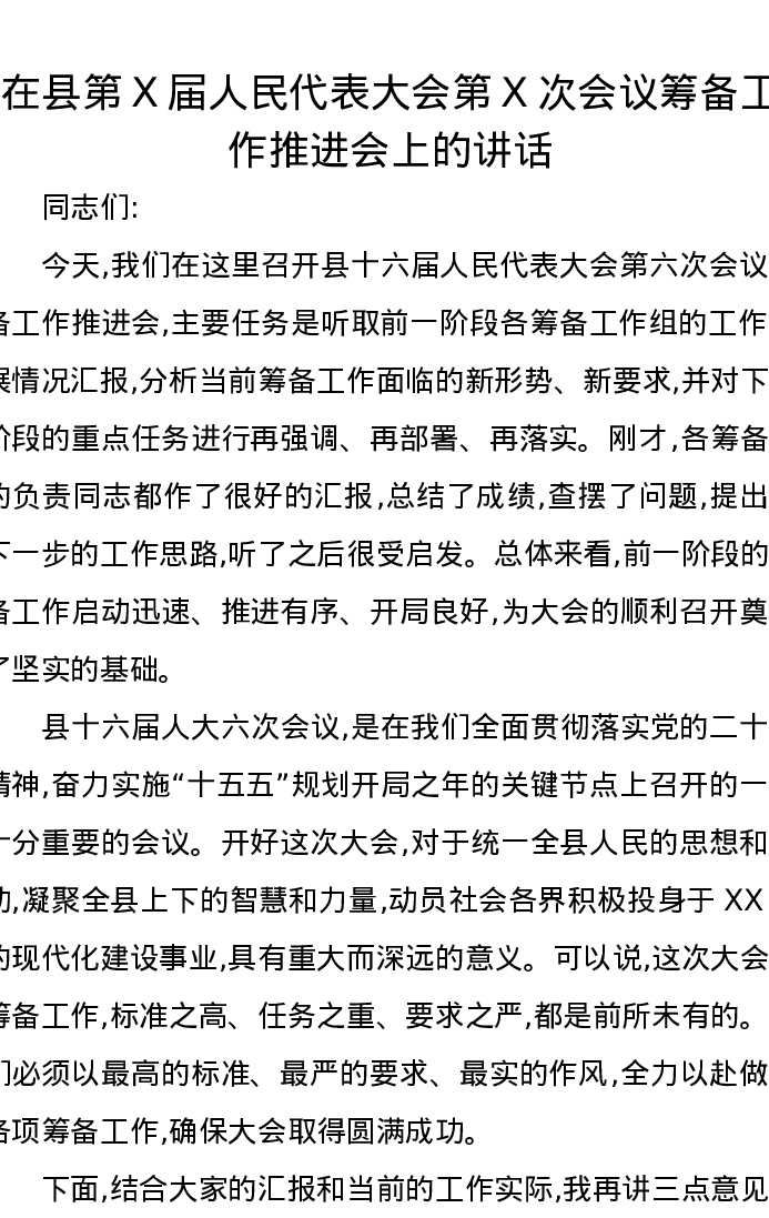 在县第X届人民代表大会第X次会议筹备工作推进会上的讲话