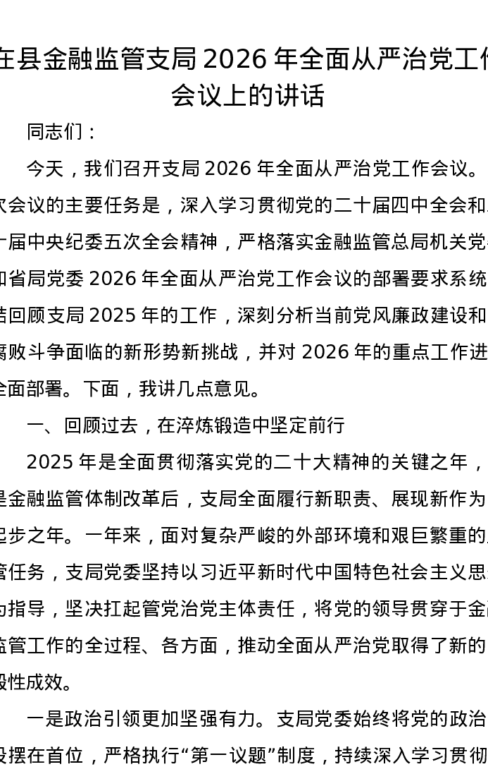 在县金融监管支局2026年全面从严治党工作会议上的讲话
