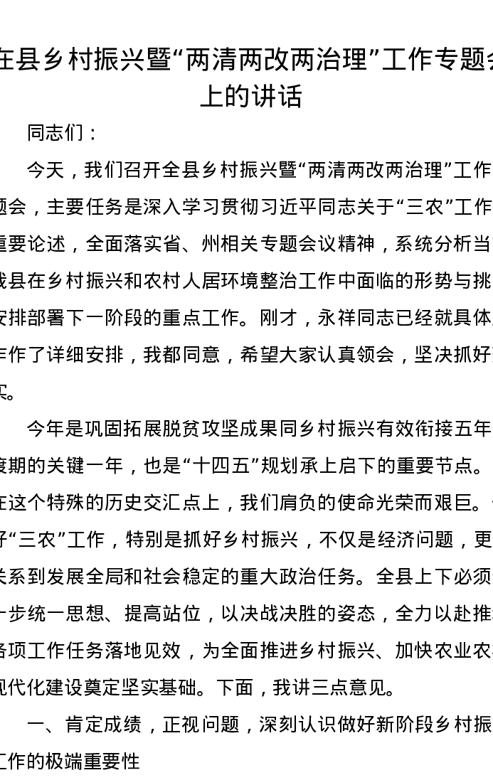 在县乡村振兴暨两清两改两治理工作专题会上的讲话