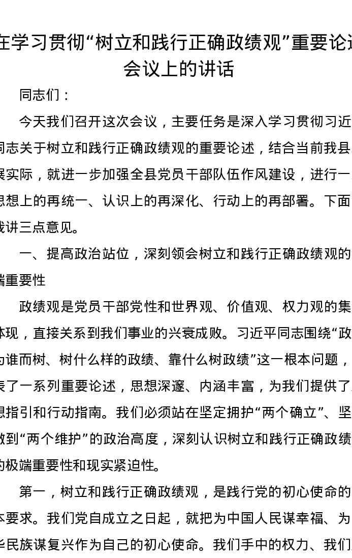 在学习贯彻树立和践行正确政绩观重要论述会议上的讲话