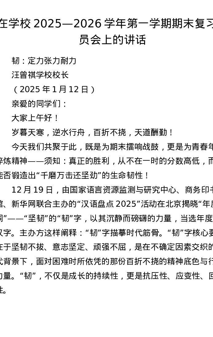 在学校2025—2026学年第一学期期末复习动员会上的讲话