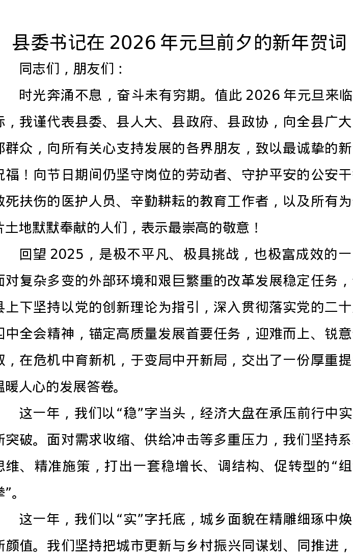 县委书记在2026年元旦前夕的新年贺词