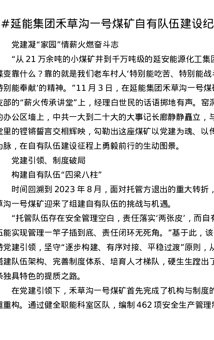 延能集团禾草沟一号煤矿自有队伍建设纪实