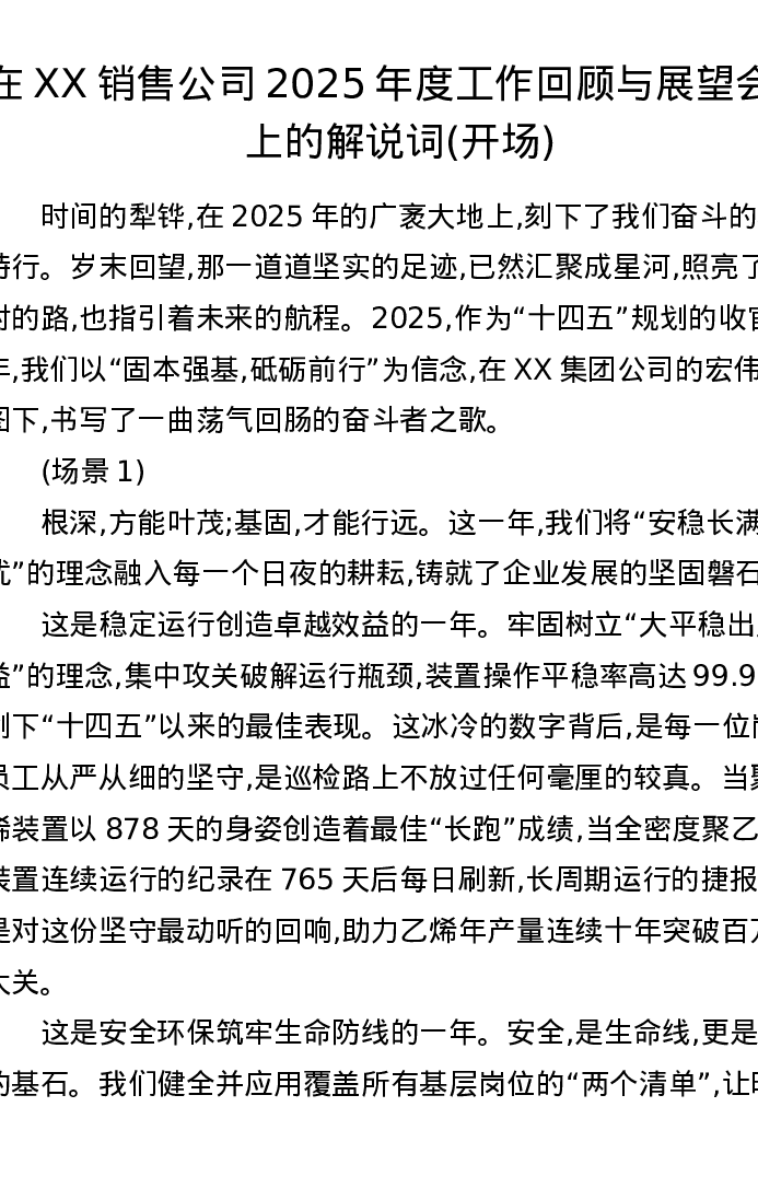 在XX销售公司2025年度工作回顾与展望会议上的解说词(开场)