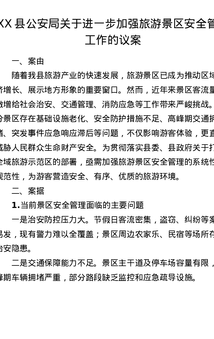 调研报告:XX县公安局关于进一步加强旅游景区安全管理工作的议案