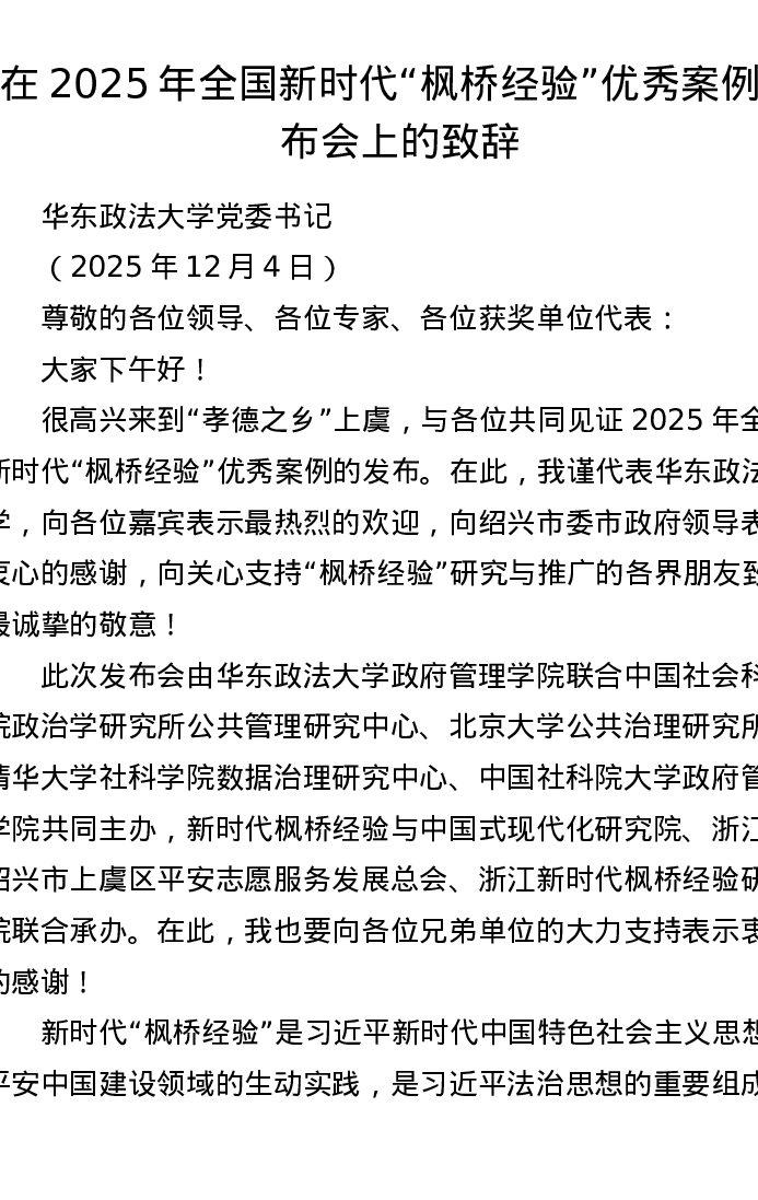 在2025年全国新时代枫桥经验优秀案例发布会上的致辞