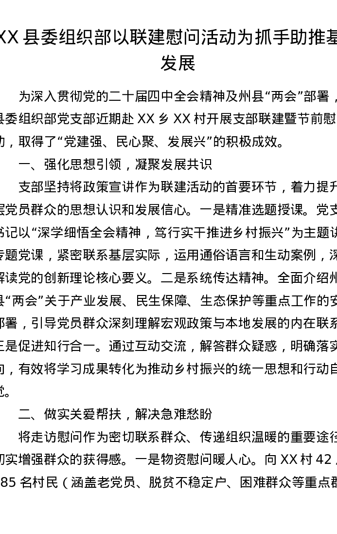 XX县委组织部以联建慰问活动为抓手助推基层发展