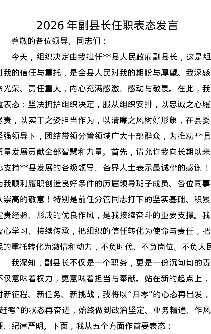 2026年副县长任职表态发言