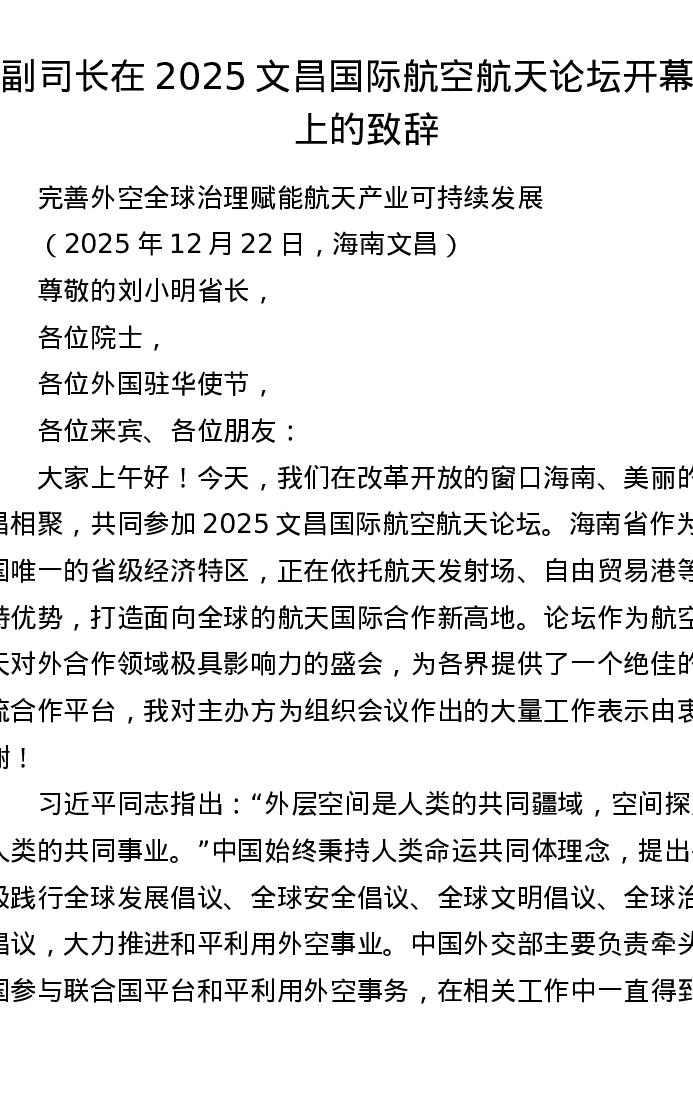 副司长在2025文昌国际航空航天论坛开幕式上的致辞