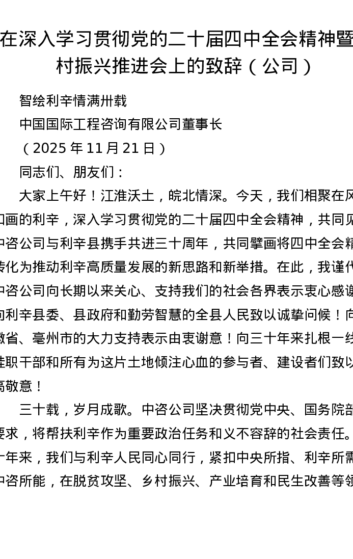 深入学习贯彻党的二十届四中全会精神暨乡村振兴推进会上的致辞(公司)