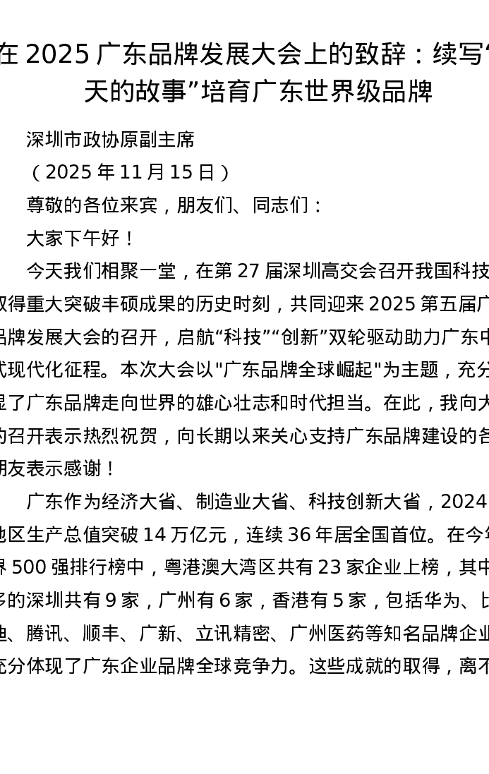 在2025广东品牌发展大会上的致辞:续写春天的故事培育广东世界级品牌