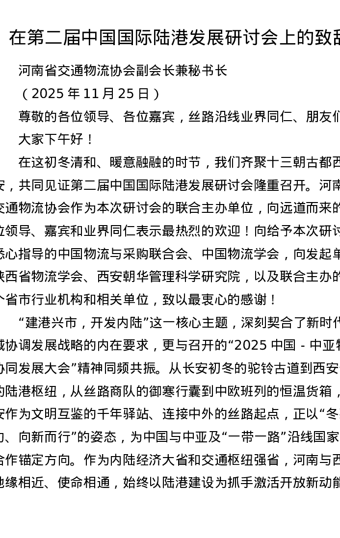在第二届中国国际陆港发展研讨会上的致辞