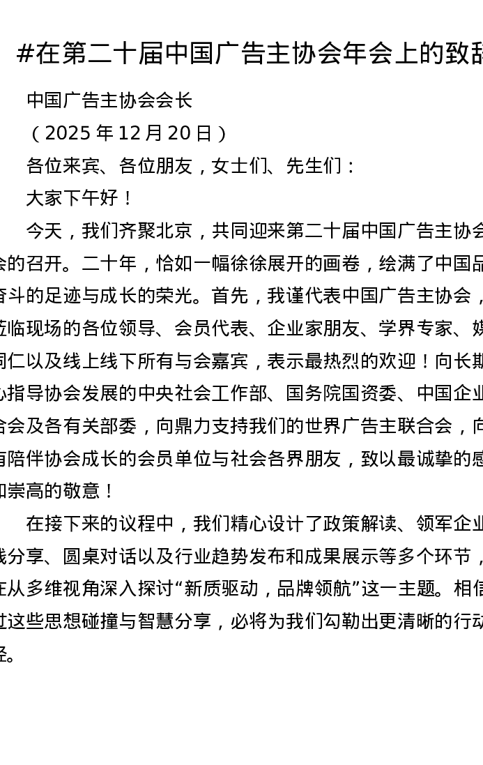 在第二十届中国广告主协会年会上的致辞