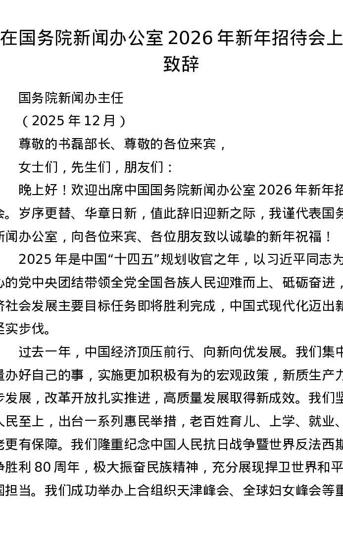 在国务院新闻办公室2026年新年招待会上的致辞