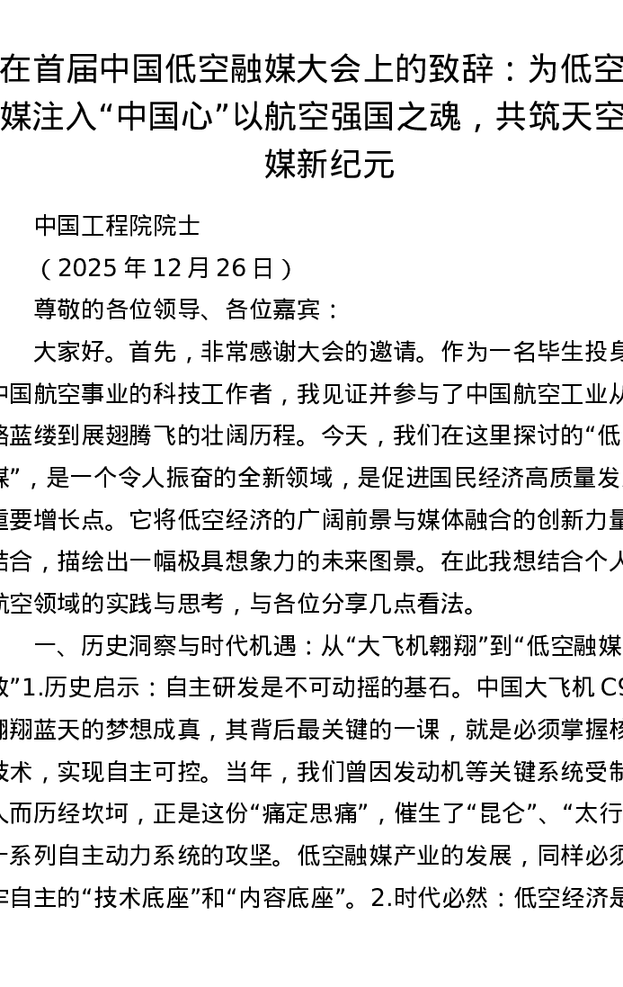 在首届中国低空融媒大会上的致辞:为低空融媒注入中国心以航空强国之魂,共筑天空融媒新纪元