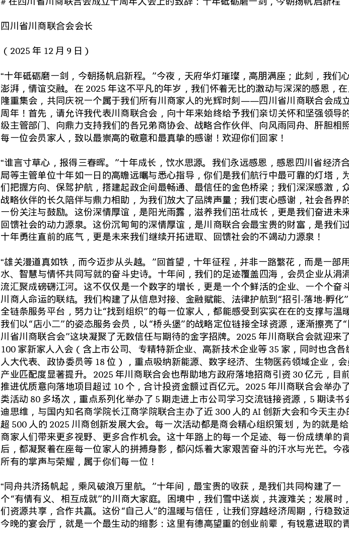 在四川省川商联合会成立十周年大会上的致辞:十年砥砺磨一剑,今朝扬帆启新程