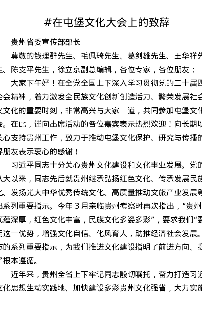 在屯堡文化大会上的致辞