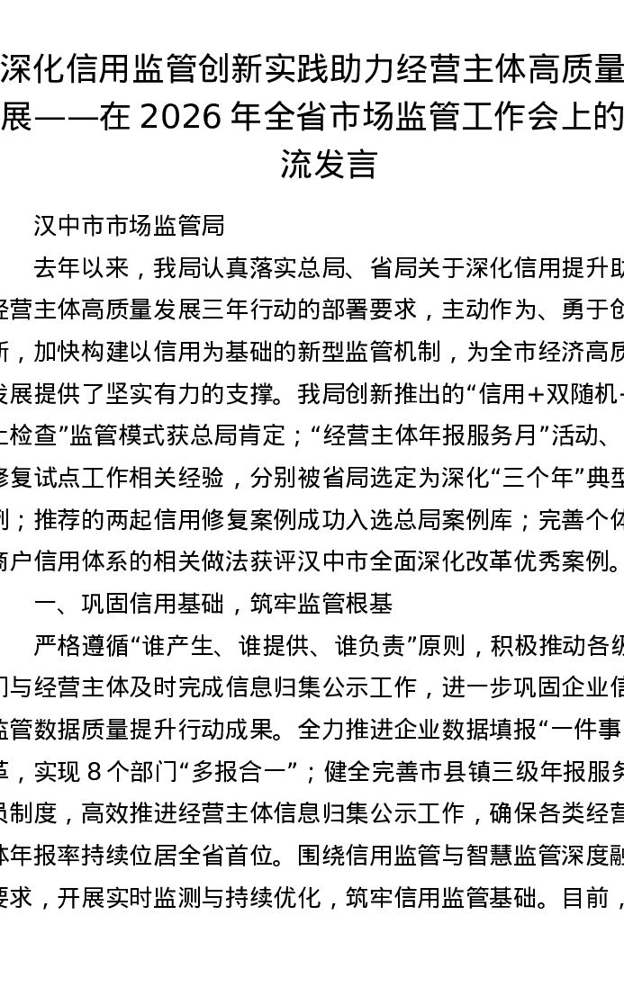 深化信用监管创新实践 助力经营主体高质量发展——在2026年全省市场监管工作会上的交流发言